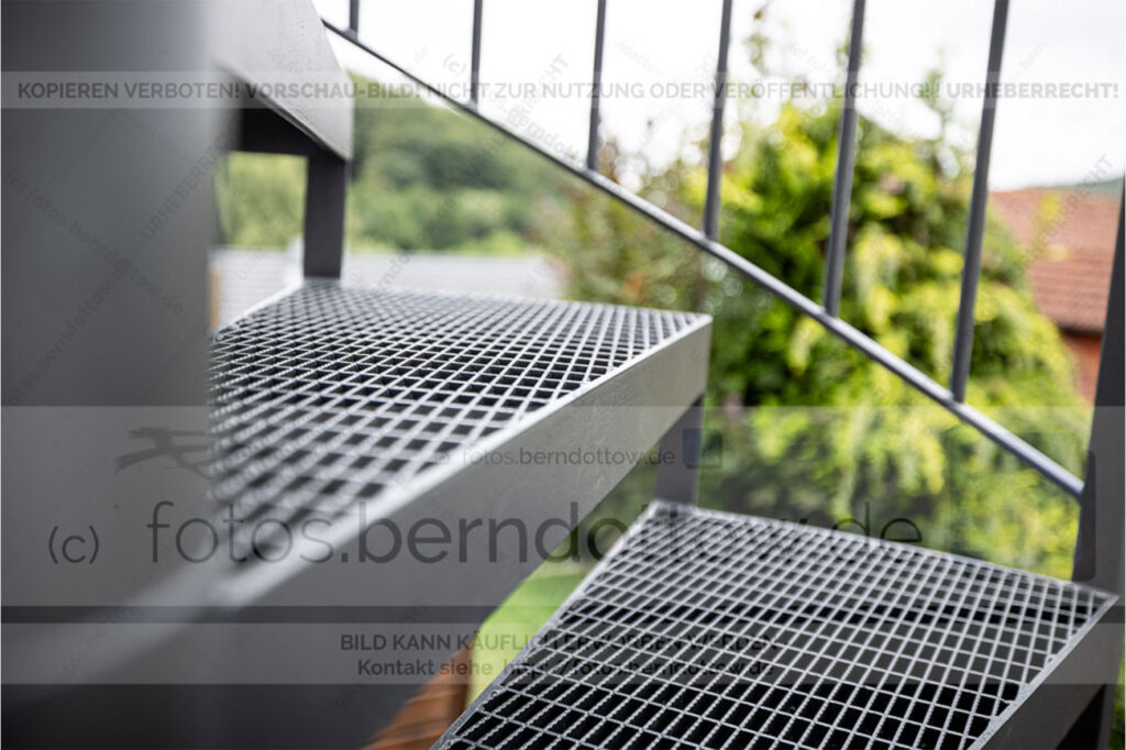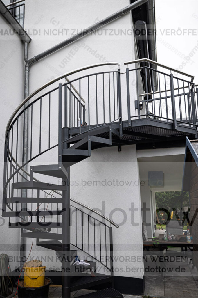 Balkongeländer mit Spindeltreppe Material: Stahl feuerverzinkt u. pulverbeschichtet. Handlauf aus Edelstahl.