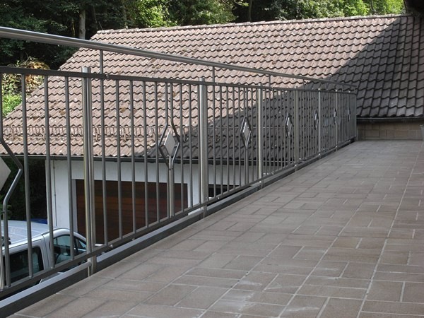 Edelstahlgeländer mit pulverbeschichtetem Lochblech als Füllung.