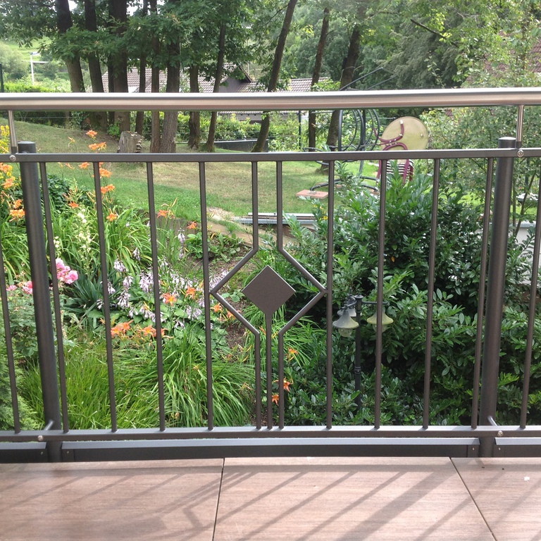 Geländer Glimmer-Graphit beschichtet mit Zierelement zwischen Handlauf und Obergurt.